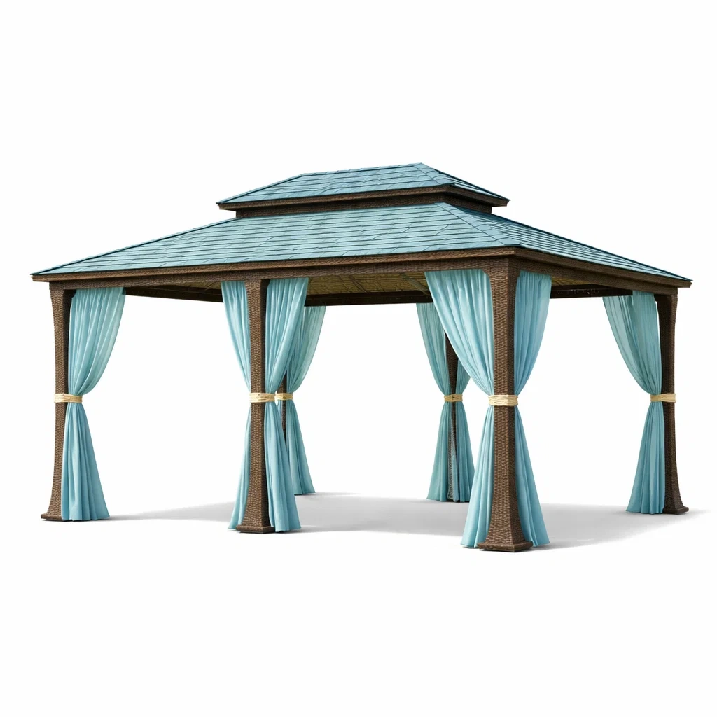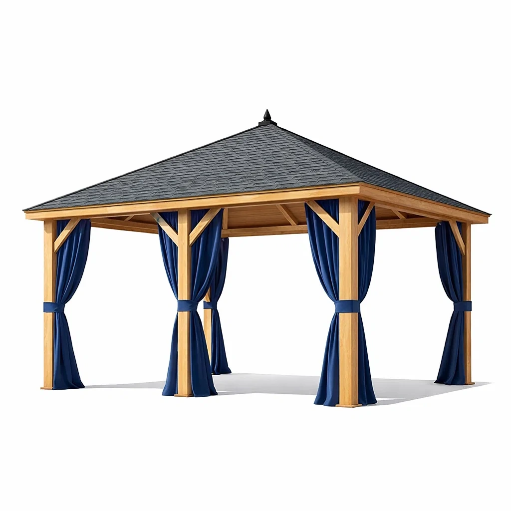 Bois Pavillon avec Toit en Bardeaux et Rideaux Bleus