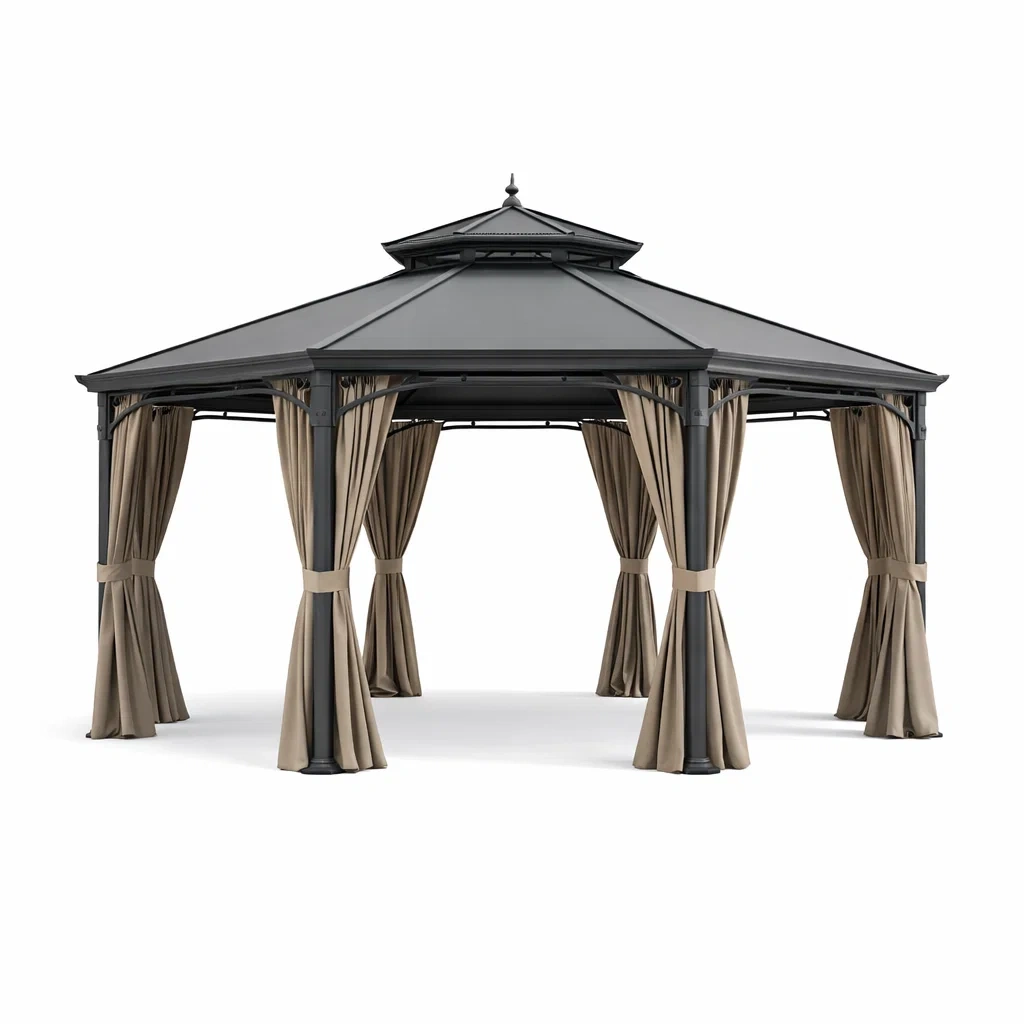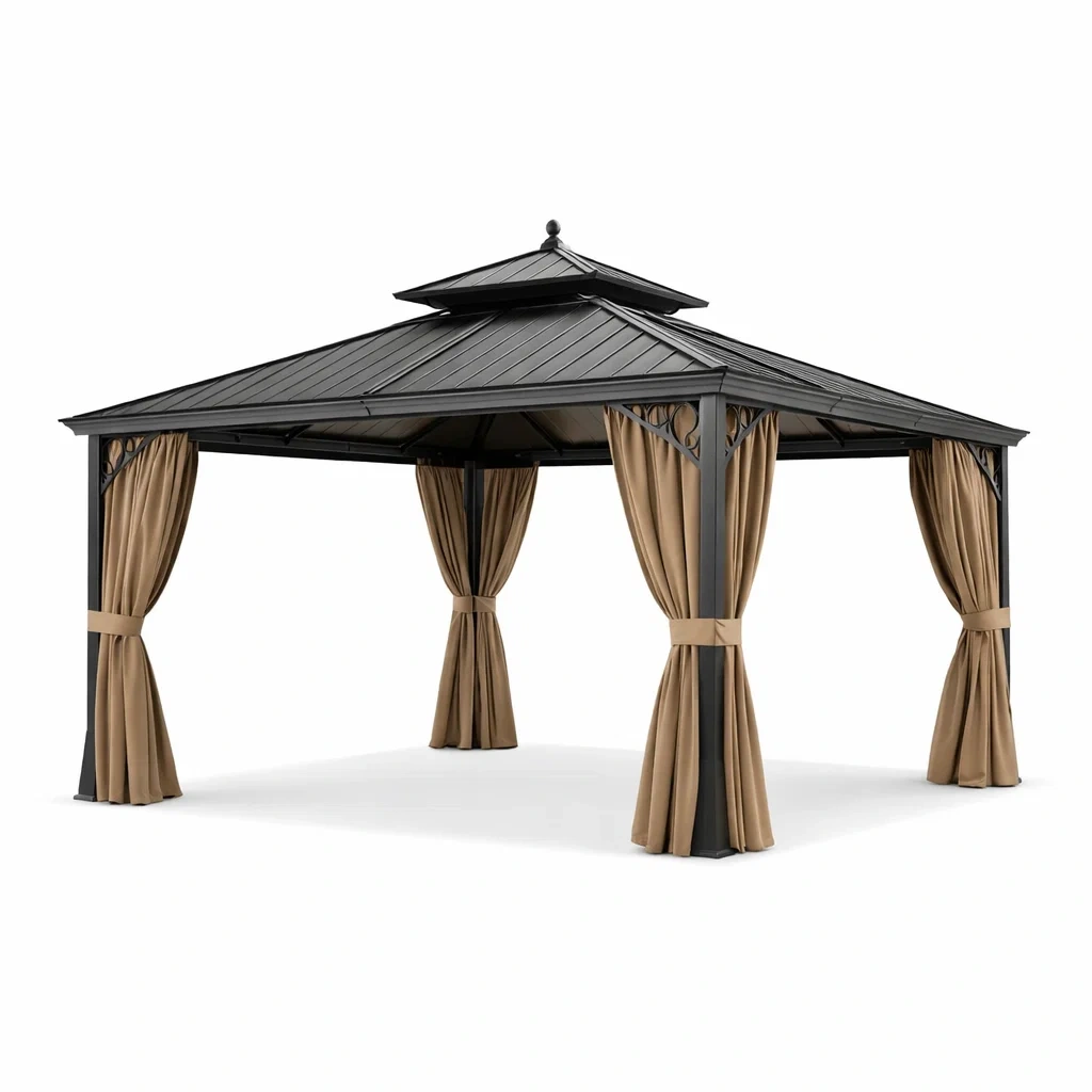 Aluminium Pavillon avec Toit en Acier Marron et Rideaux en Polyester Beige