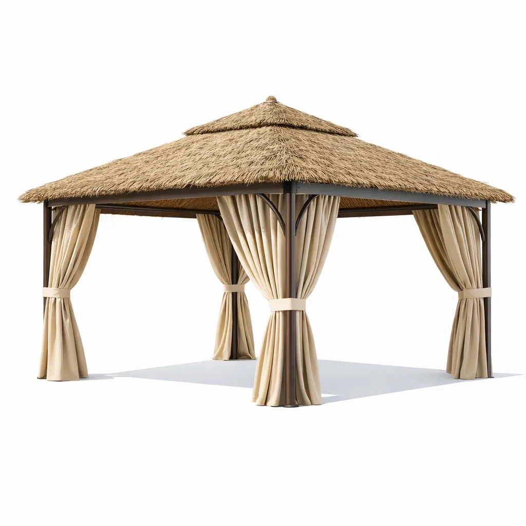 Métal Pavillon avec Toit en Paille et Rideaux Beige