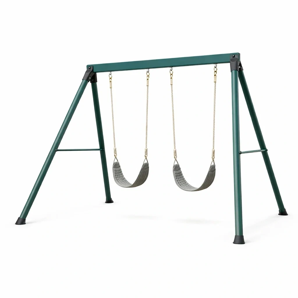 Ce portique à balançoire est fabriqué en acier avec des sièges en polyéthylène haute densité.