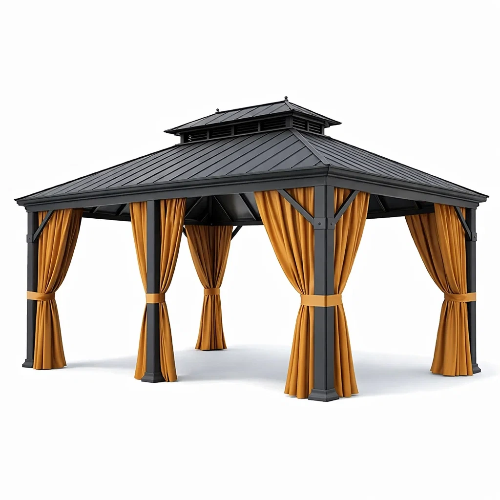 Matériaux : Structure en aluminium avec toit en acier galvanisé, rideaux en polyester.