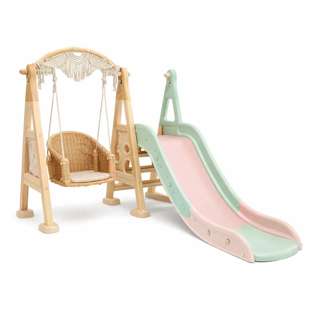 Ce produit est un ensemble comprenant une balançoire et un toboggan pour enfants. La structure de la balançoire est en bois de pin avec un siège en rotin naturel, et le toboggan est fait de plastique polyéthylène robuste. Le toboggan mesure 150 cm de long, et la balançoire a une hauteur totale de 120 cm.