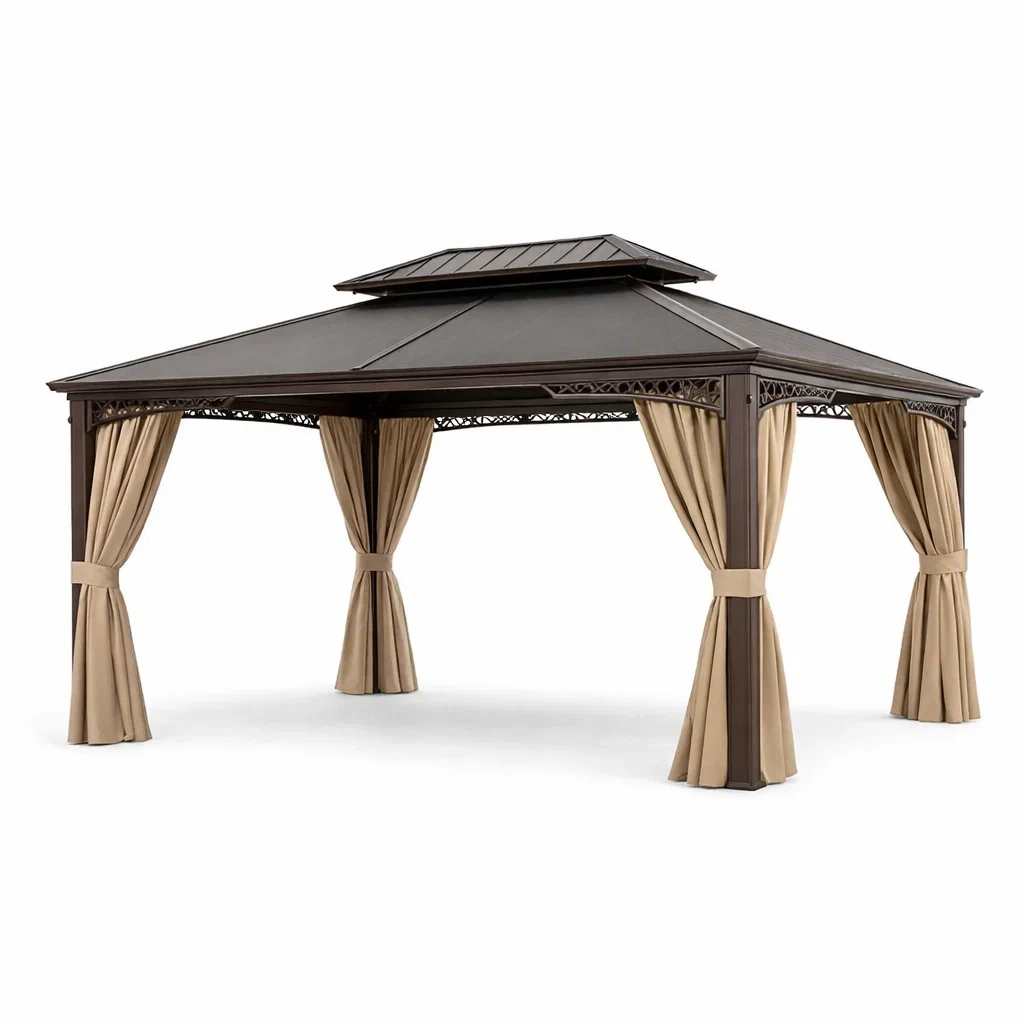 Structure en acier avec des panneaux de toit en aluminium. Rideaux en polyester pour une meilleure protection.