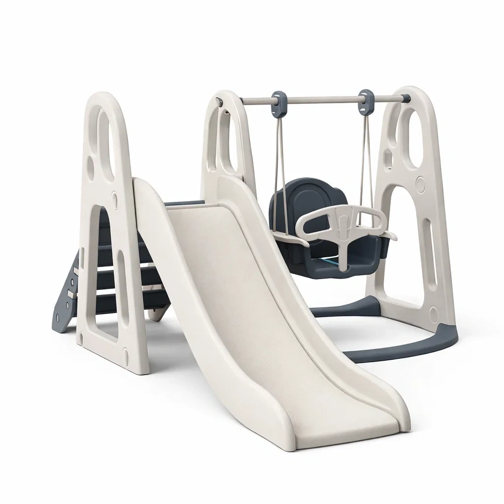 Ensemble de jeux en plastique HDPE comprenant un toboggan et une balançoire. Dimensions du toboggan : hauteur 105 cm, largeur 150 cm, profondeur 140 cm. Poids total : 15 kg. Convient pour les enfants de 1 à 6 ans. Conforme à la norme EN 71. À utiliser sous la surveillance d'un adulte.